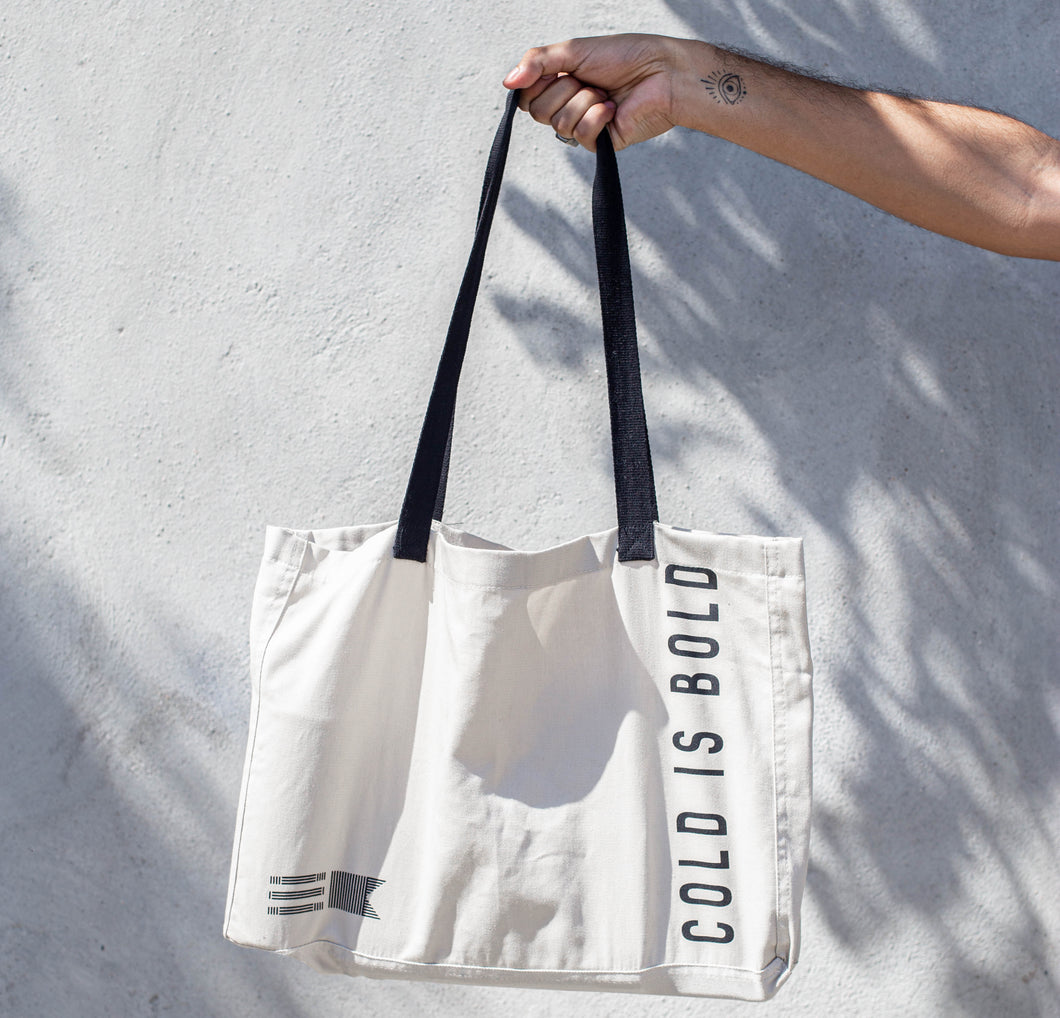 La Totebag COLD IS BOLD presenta banderas MANIFESTO y está confeccionada en una mezcla de algodón con cintas de algodón negro.
