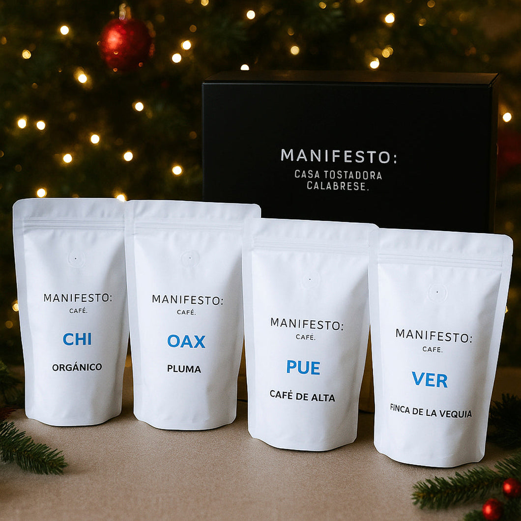 La caja incluye 4 paquetes de 250 g, uno por cada región, tostados artesanalmente bajo el método calabrés, resaltando el carácter y la identidad de cada origen.